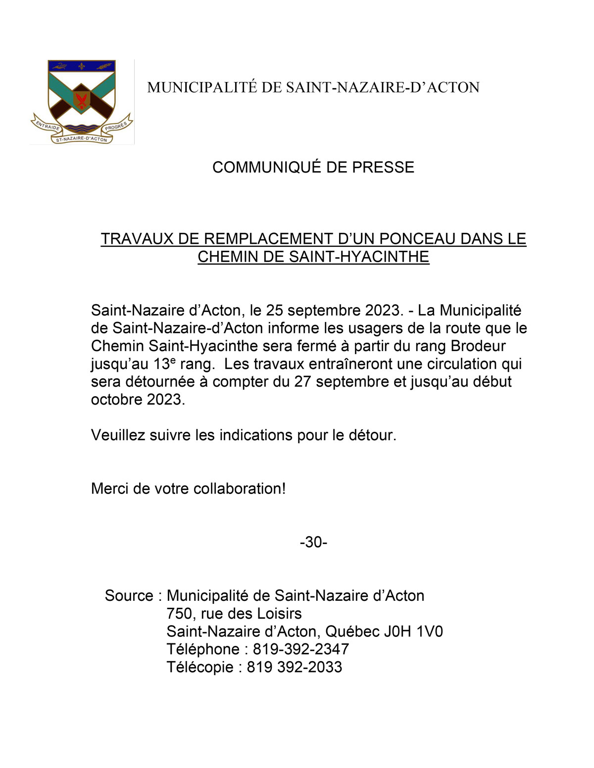 Communiqué de presse – Travaux de remplacement d’un ponceau dans le chemin de saint-hyacinthe