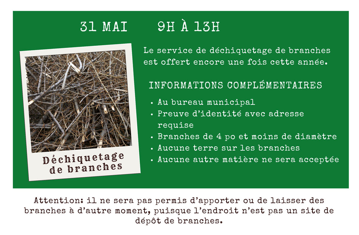Déchiquetage de branches – 31 mai de 9h à 13h