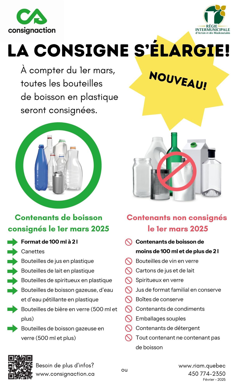 Le 1er mars 2025 marque un nouveau virage pour la consigne au Québec. En effet, à compter de cette date, toutes les bouteilles de boisson en plastique, de format de 100 ml à 2 l, seront consignées. Étant donné les nombreux ajustements concernant l’élargissement de la consigne au cours des dernières années, la Régie tient à rappeler les changements puisqu’aux contenants de boissons consignés pour lesquels une consigne de 10¢ est perçue, s’ajouteront, notamment, les bouteilles d’eau, d’eau pétillante et de jus en plastique de 100 ml à 2 l. Il sera peut-être temps de passer à la bouteille réutilisable pour plusieurs avec cette hausse du coût à l’achat.