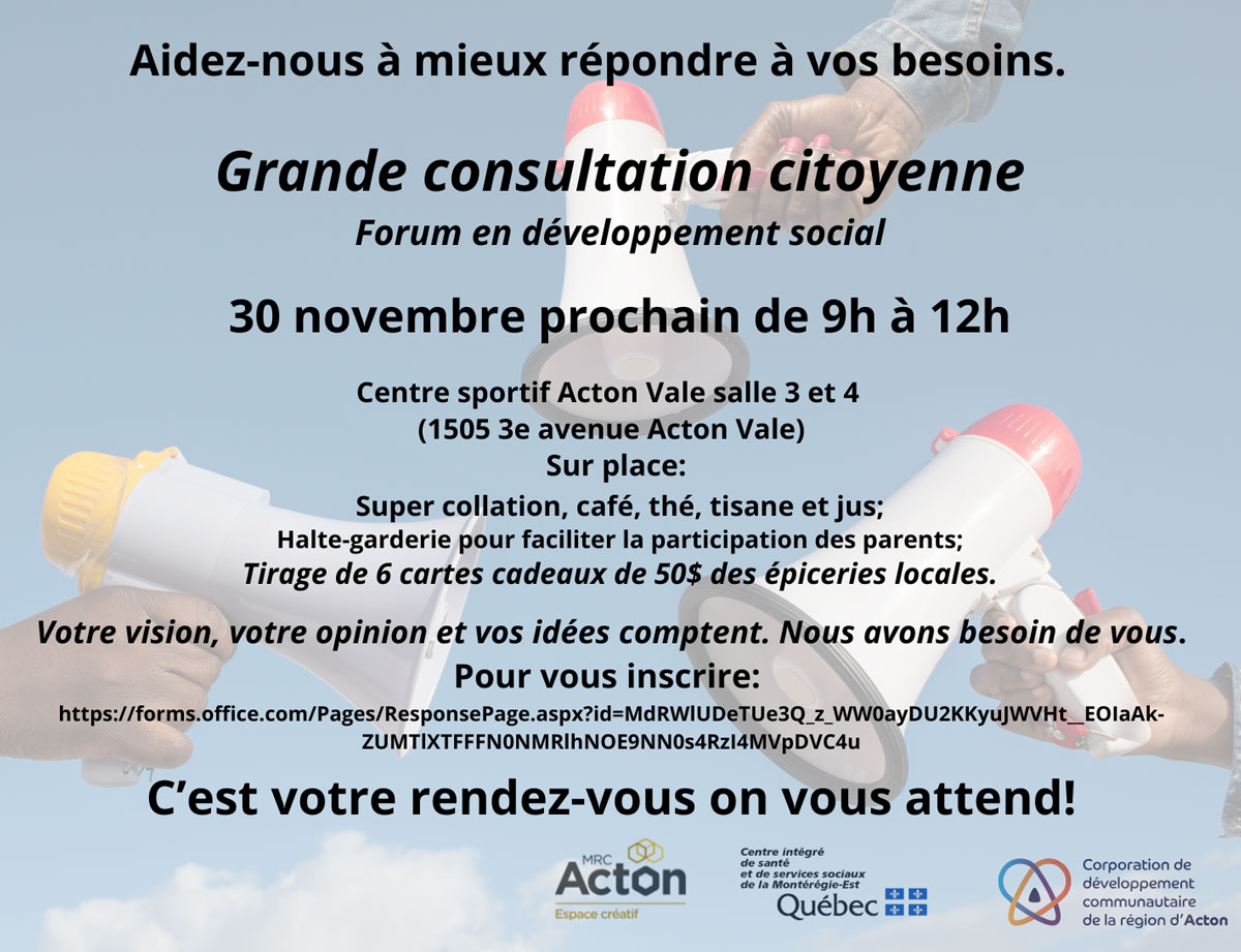 Voici l’invitation au Grand Forum (2e partie qui inclut la grande consultation citoyenne) qui aura lieu ce samedi 30 novembre de 9h à 12h.