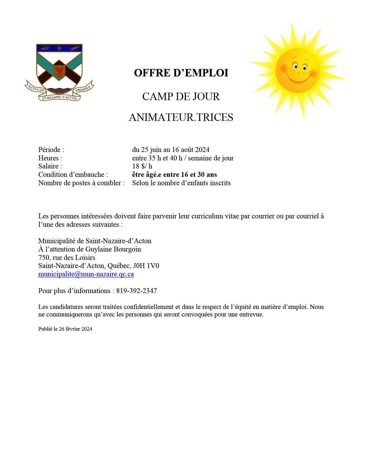 © 2024 Copyright, tous droits réservés - Municipalité de Saint-Nazaire d'Acton. Conception Idéocom