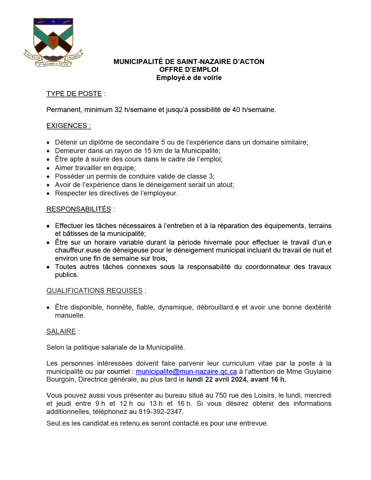 OFFRE D’EMPLOI Employé.e de voirie
