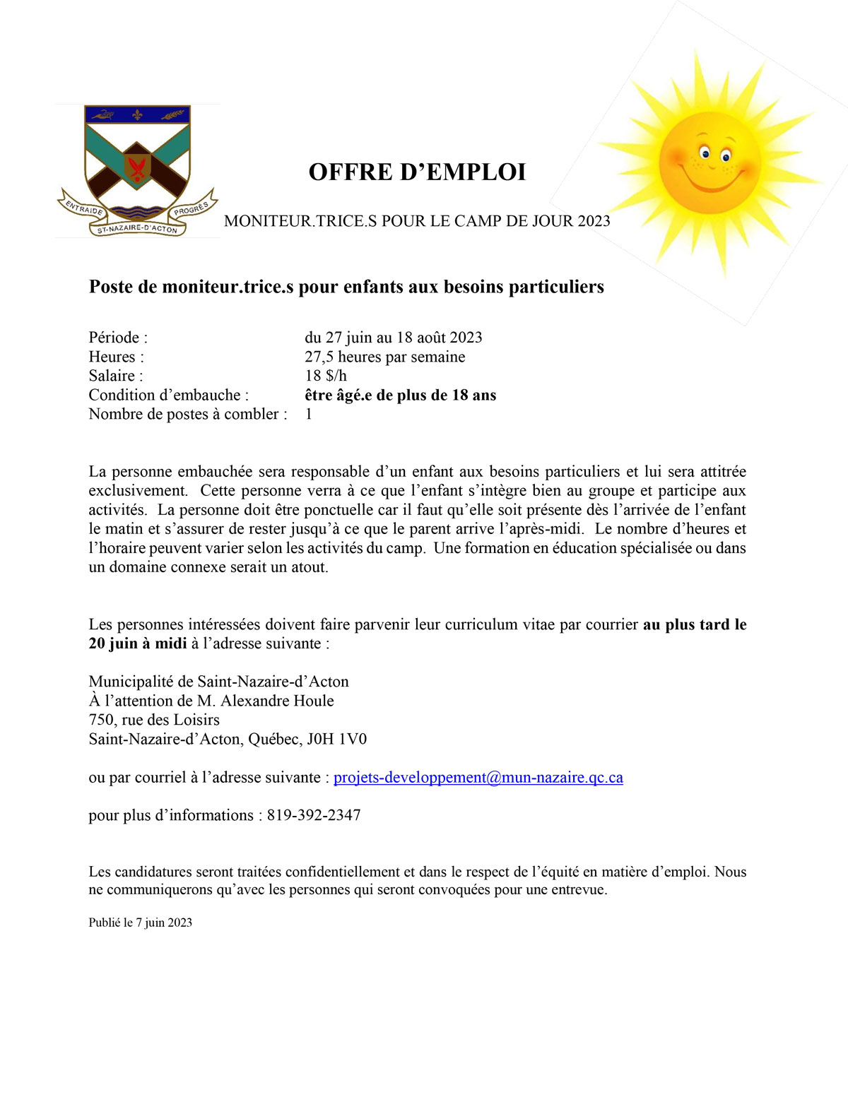 OFFRE D’EMPLOI – MONITEUR.TRICE.S POUR LE CAMP DE JOUR 2023